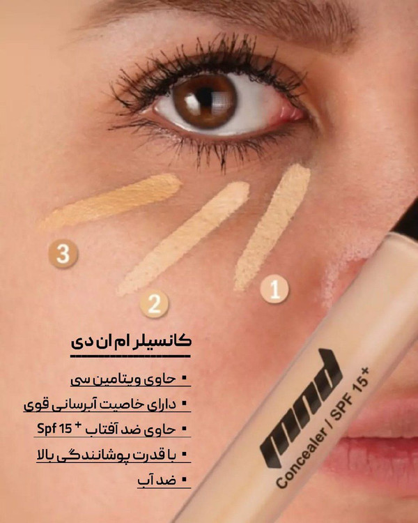 کانسیلر ام ان دی غلظت بالایی داره و میتونه به خوبی نقصهای پوستی مثل آکنه و قرمزی ناشی از اون، لک پوستی، گودی و سیاهی زیر چشم و خط لبخند رو پوشش بده!💯😍